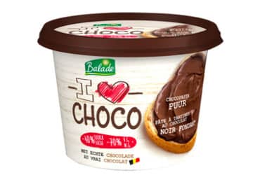 De smeerpasta I Love Choco van Balade, van Belgische chocolade, bevat 49% magere melk en 25,5% chocolade. Zonder palmolie…